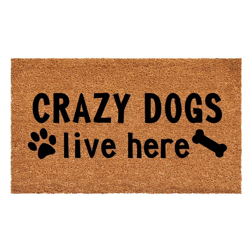 Make a statement with our "Crazy Dogs Live Here" Doormat, a playful nod to the lively energy of your furry friends. Crafted with durable materials and a touch of humor, this whimsical mat sets a fun and welcoming tone for your home. Embrace the joyful chaos as you invite visitors in, where every step is met with the warmth and wag of happy tails. Made of natural coir, a dense fiber that is naturally mold and mildew resistant. Coir is a renewable resource that is durable and coarse, excellent for scraping shoes clean. Vinyl backed for increased durability and to help prevent movement, coir doormats are weather tolerant absorb moisture and retain their shape. For best results keep in a sheltered area such as a covered porch, keeping extreme moisture and sunlight to a minimum. Vacuum, sweep or lightly hose clean.