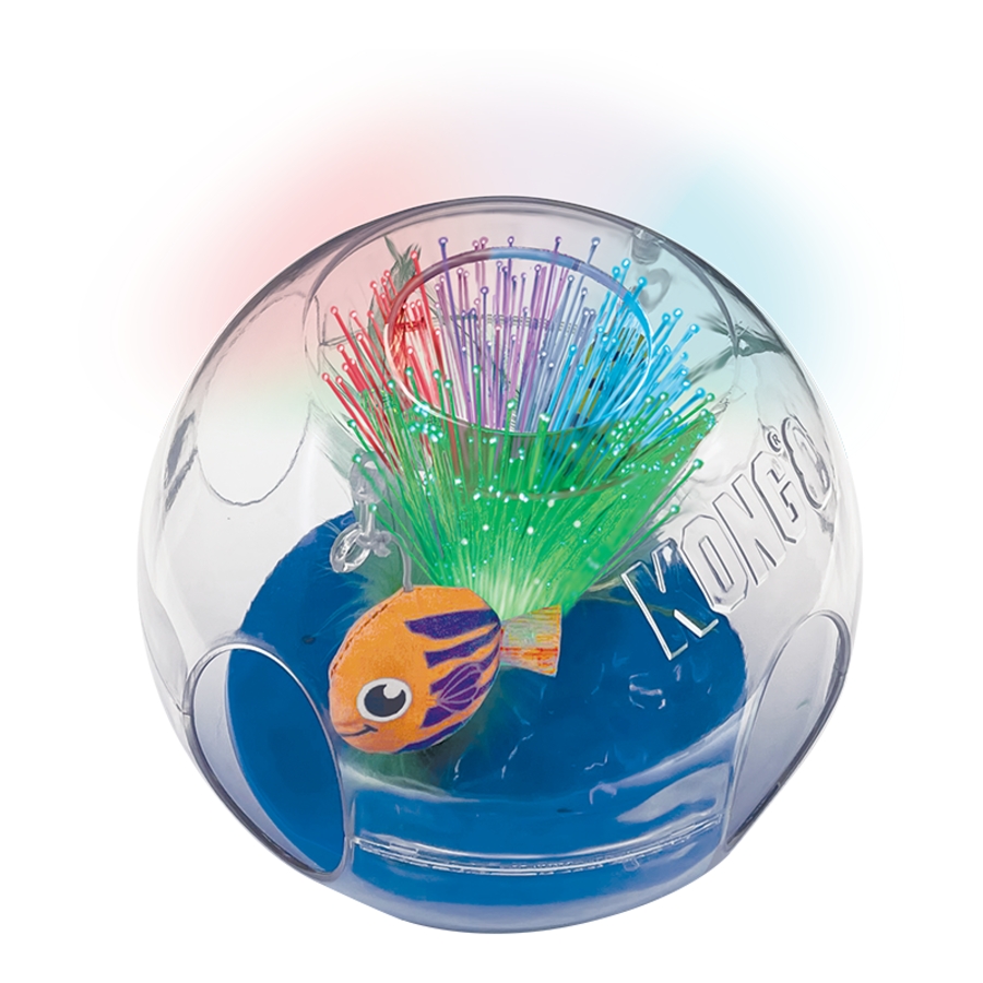 KONG Bat-A-Bout Glow’s fiber optics shine when cats tap the bowl, illuminating an irresistible undersea world rippling with a rainbow of light as the fibers move, inviting batting and satisfying nocturnal instincts. The wobbly bowl, dangling fish, and fluttery feather movements intrigue while KONG Premium North American Catnip inside the fish extends the fun.