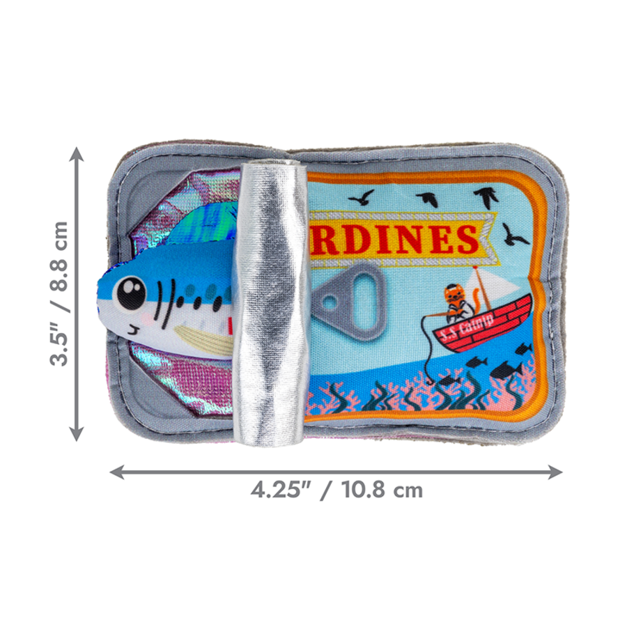 Crackles Sardine flips and flops out of its crackling fabric tin for fishy fun! Tethered by an elastic cord, this toy lures cats to pounce, capture, and wrestle, fueled by KONG Premium North American Catnip and an inner bell. Hide treats inside for added enrichment.