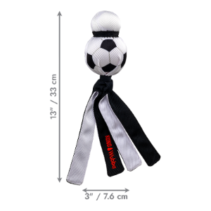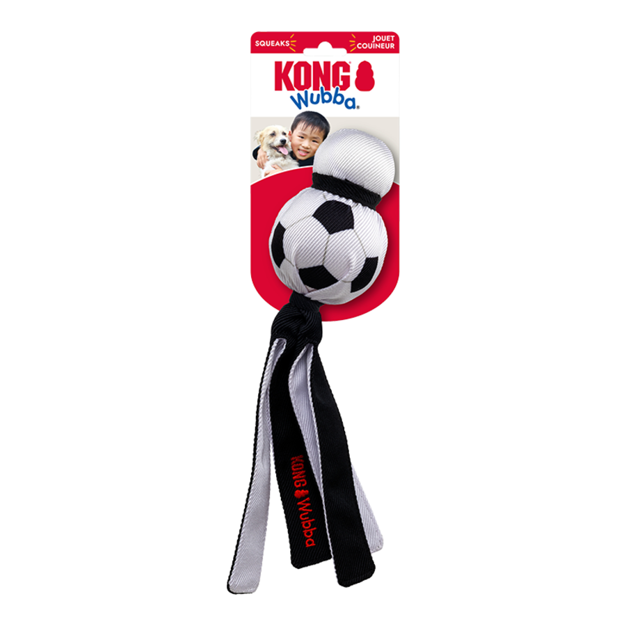 KONG Wubba Sport Soccerball features a long, floppy tail to ignite shaking instincts, adding fun and excitement to tugging and fetching sessions! The long tail also makes it just as easy for humans to toss as it is for dogs to pick up. While this toy is made with reinforced ballistic material and stitching for added durability, it's still gentle on dogs’ teeth. It is perfect for both interactive and independent play—complete with a squeaker to keep playtime lively and engaging.